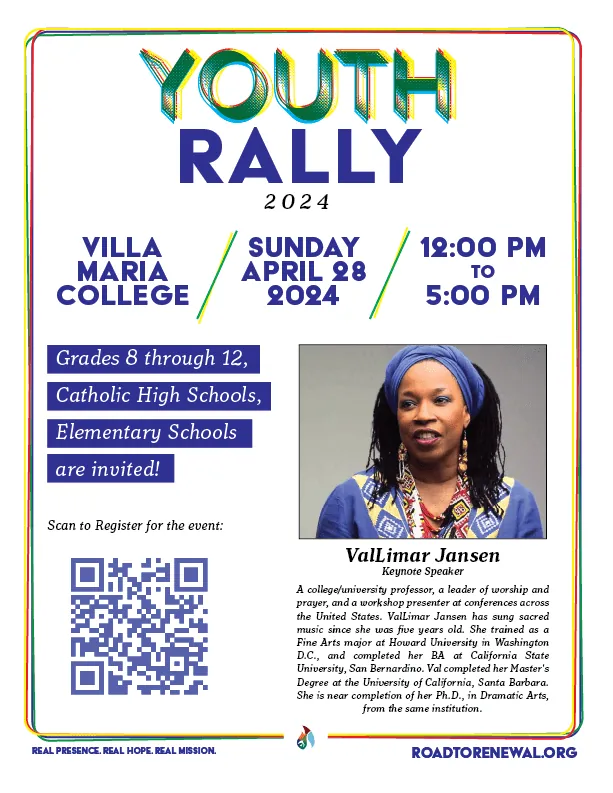 Sunday, April 28, 2024 from 12:00 pm to 5:00 pm at Villa Maria College Grades 8 through 12, Catholic High Schools, Elementary Schools are invited!Keynote speaker for the event is ValLimar Jansen. She is a college/university professor, a leader of worship and prayer, and a workshop presenter at confe